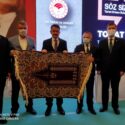 Toplantının sonunda Başkan Akay Bakan Pakdemirli’ye meşhur el dokuması Bünyan Halısı hediye etti. -KURUM BÜLTENİ
