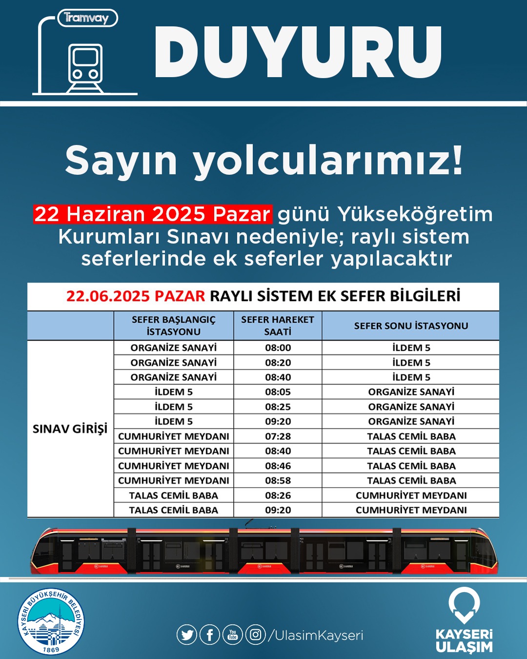 Son olarak sınav günlerinde vatandaşlara seslenen Başkan Büyükkılıç, “Yükseköğretim Sınavı’na girecek adaylar, otobüs ve tramvaylardan ücretsiz yararlanabileceklerdir. Sınavların yapıldığı saatlerde özellikle yerleşim alanlarında gürültüye sebep olabilecek davranışlardan kaçınılmasını, sürücülerimizin korna veya siren çalmamalarını ve inşaat faaliyetlerinin durdurulmasını önemle rica ediyorum” dedi.