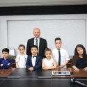 Alpaslan İlkokulu 2.sınıf öğrencilerini misafir eden Başkan Çolakbayrakdar, çocuklarla tek tek ilgilendi. Ziyarette öğrencilere, Okul Müdürü Ercan Duran, Müdür Yardımcıları Şeyma Yıldız ve Duygu Koray ile Yeni Mahalle Muhtarı Kadir Sağıroğlu eşlik etti. Minik öğrencilerle sohbet eden Başkan Çolakbayrakdar, makam koltuğunu sırasıyla Melis Karaöz, Hüseyin Yağız Derin, Elifsu Hasaltın, Ülke Fidan, Mustafa Serdar Seyitoğlu, Muhammed Umut Özcan’a teslim etti. Makam koltuğuna oturmanın heyecanını yaşayan öğrenciler, yeşil alanların artırılması ve yolların daha konforlu olması için Park ve Bahçeler Müdürü İrem Yıldırım’ı ile Fen İşleri Müdürü Ümit Tokcan’ı arayıp, talimatlar verdi.