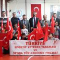 Develi’de dün yapılan Türkiye Sportif Yetenek Taraması ve Spora Yönlendirme Projesi ilk gününde taramaya katılan öğrenciler ellerindeki Türk Bayraklarıyla Mehmetçiğe selam gönderdi.