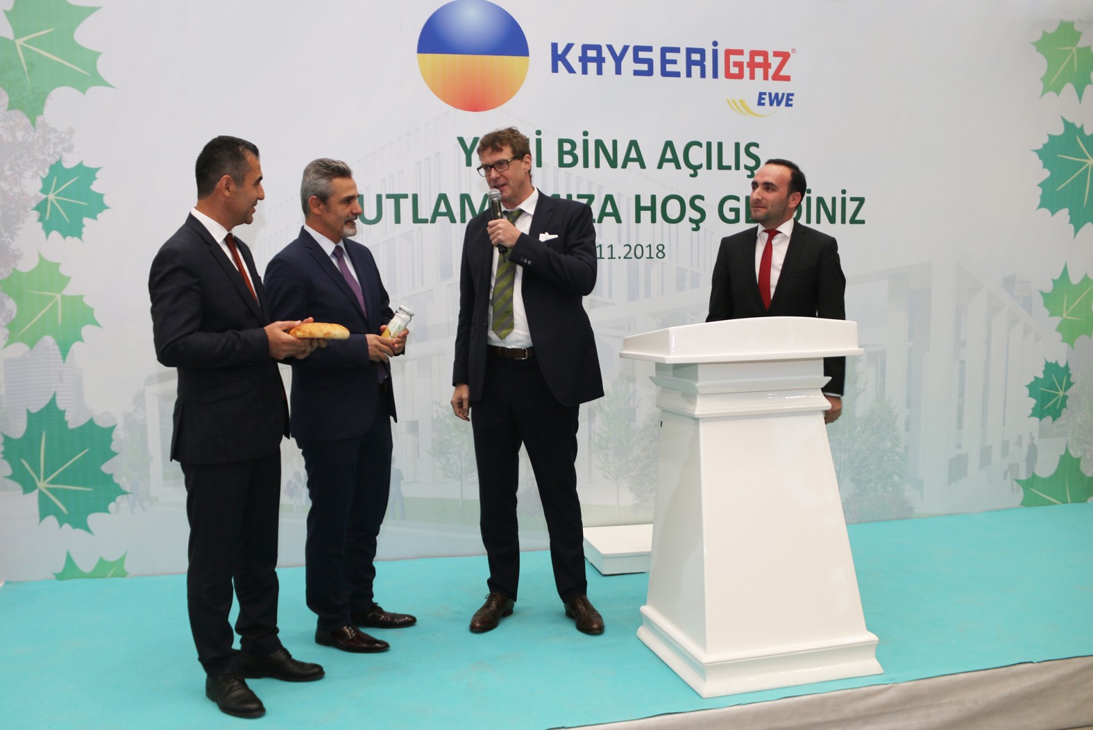 EWE Turkey Holding CEO’su Frank Quante konuşmasında “Alman geleneğinde yeni bir eve giderken tuz ve ekmek götürürüz Kayserigaz’ın yeni hizmet binası bereketli olsun” diyerek getirdiği ekmek ve tuzu Kayserigaz Genel Müdürü Adem Dincay ve Enervis Genel Müdürü Osman Kipoğlu’na hediye etti.