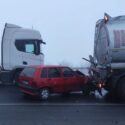 Kayseri’de sis yüzünden meydana gelen zincirleme trafik kazasında çevre güvenliği alınırken hızını düşüremeyen yolcu otobüsü de diğer araçların arasından geçerek yoldan çıktı.