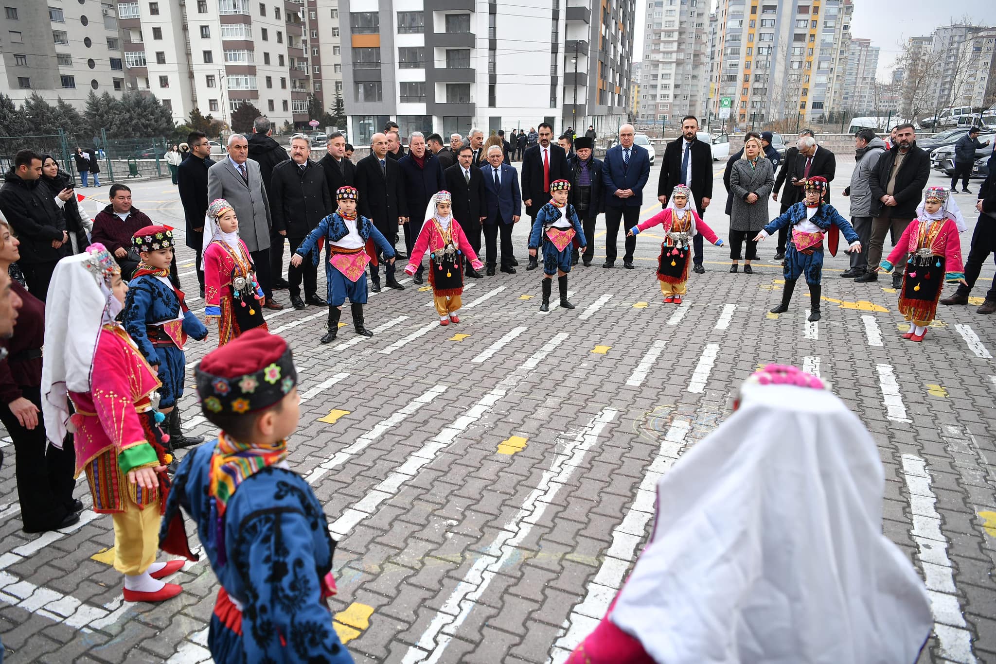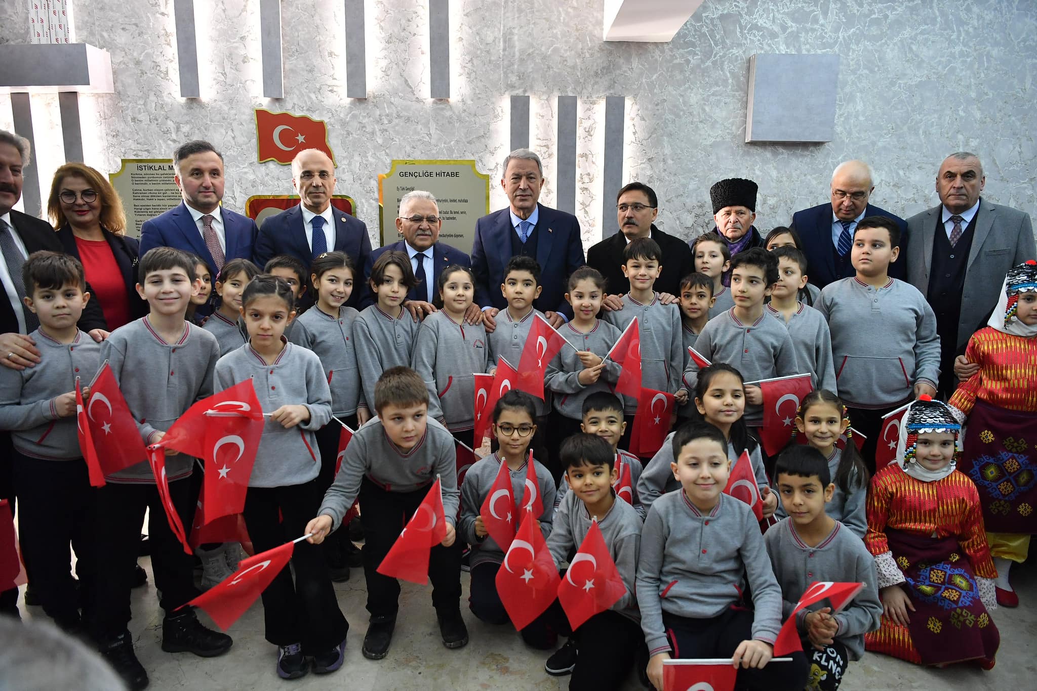 Öğrenciler, Başkan Büyükkılıç, Akar ve beraberlerindeki heyeti ellerinde Türk bayrakları ve çiçeklerle karşıladı.
