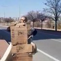 Korona virüs salgını nedeniyle uygulanan sokağa çıkma yasağında Kayseri’nin Talas ilçesi 15 Temmuz Caddesi’nde ekmek aldıktan sonra evine dönen Mehmet Doğan, polis ekiplerine yakalanmamak için ilginç bir yöntem denedi. Cadde üzerinde elinde karton ve üzerine giydiği çarşaf ile yürüyen Mehmet Doğan, her araç gördüğünde yere çömelerek karton ile kendisini gizlemeye çalıştı. Uygulama yapan polis ekiplerini fark etmeyen Mehmet Doğan’ı gören ve görüntüleyen vatandaşlar gülme krizine girerken, Mehmet Doğan görüntülendiğini anlayınca büyük şaşkınlık yaşadı. Doğan, “Ben garip adamım, bu seferlik beni affetsinler. Covid-19’dan kurtulmak için kafamı kazıttım. İnşallah bu beladan kurtulacağız” diye konuştu.