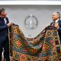 Başkan Memduh Büyükkılıç, Bakan Mehmet Muharrem Kasapoğlu’na ziyaretinin anısına kök boyadan yapılmış el dokuması kilim ve Kültepe’den çıkarılan tabletlerin replikasını hediye etti.