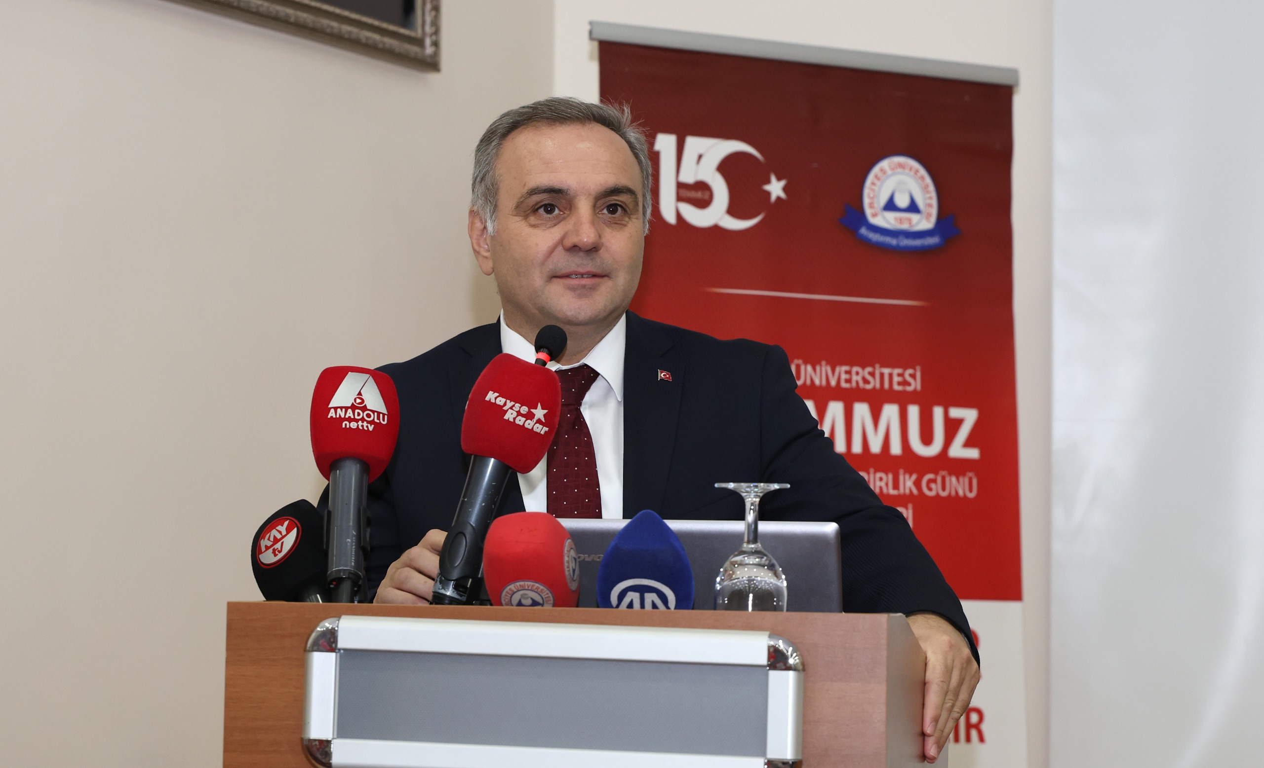 Rektör Prof. Dr. Altun, “Yaşanmışlıkları unuttuğunuz zaman tekrar yaşamaya mahkum olursunuz. Dolayısıyla bu konularda Bir farkındalık ortaya koymak, bu süreçleri gündemde tutabilmek ve sahip olduğunuz hedef kitleye bunları anlatabilmek, bilinçlendirmek son derece önemli detaylardır. Özellikle Erciyes Üniversitesi olarak 15 Temmuz 2016’da yaşamış olduğumuz bu hain darbe girişimini şiddetle kınadığımız gibi bunun tekrarlanmaması anlamında da gerekli bilince sahip olmamız gerektiğini düşünüyoruz. Ve özellikle bu konularda da üniversite olarak akademik personelimizden idari personelimize kadar 50 bini bulan öğrenci sayımızla öğrencilerimize bu bilinci vermeye gayret ediyoruz” dedi.